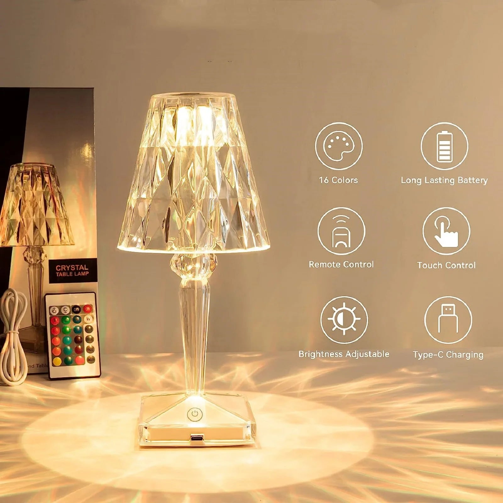 Enhance your space with this stunning 16-Color Crystal Desk Lamp, designed to create a luxurious ambiance with its crystal effect. Featuring a touch control panel, you can easily switch between 16 vibrant colors, adjust brightness levels, and choose from different lighting modes to suit any mood.